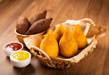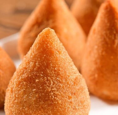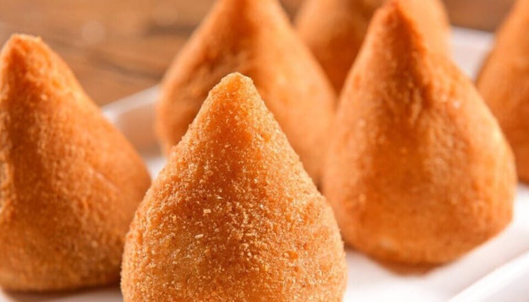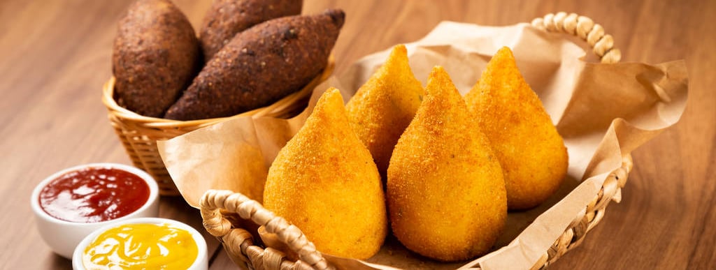 Coxinha crocante com massa de batata e recheio cremoso com requeijão